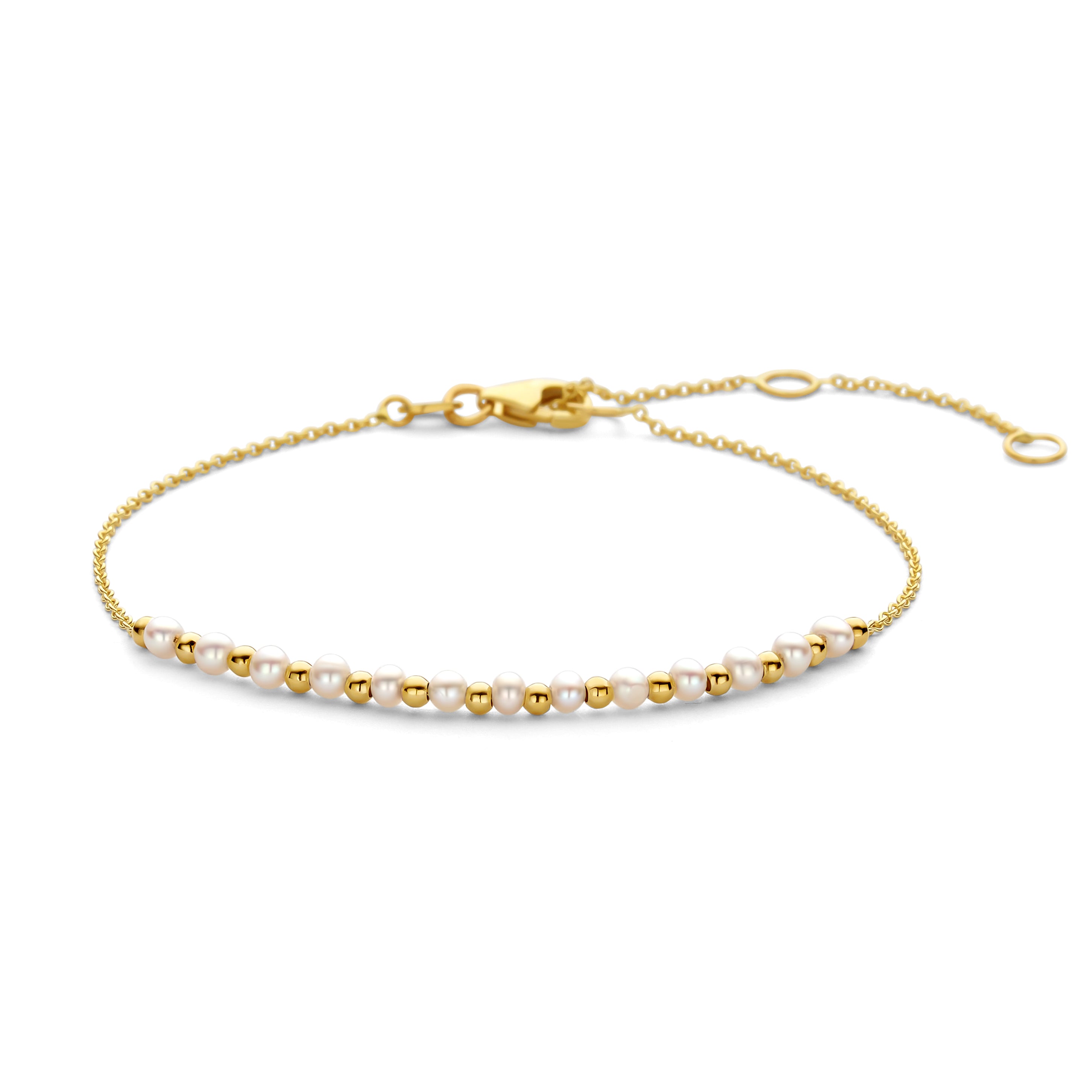 Laat je betoveren door een armband die zachtheid en sprankeling moeiteloos verenigt. De combinatie van warme gouden glans en zachte parelglans voelt als een fluistering op de huid. Subtiel en verfijnd, maar met een uitstraling die blijft hangen. Dit is een sieraad dat elke beweging een vleugje elegantie geeft en je herinnert aan de schoonheid van eenvoud. Tijdloos, teder en gemaakt om altijd bij je te dragen.