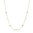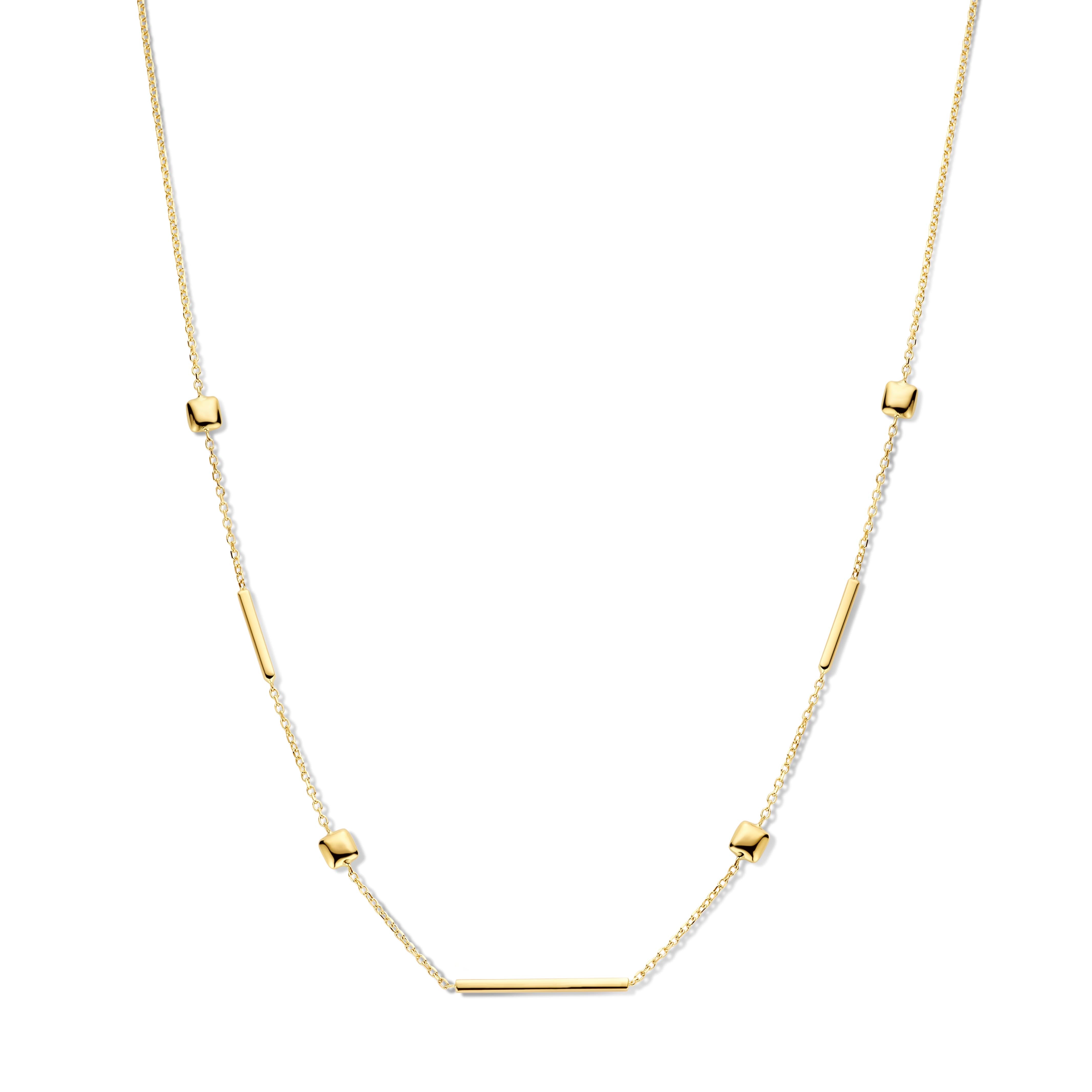Een ketting die moeiteloos verfijning uitstraalt. De subtiele afwisseling van vormen voegt een ritmisch accent toe zonder de rust te verstoren. Elk detail is zorgvuldig geplaatst om balans en elegantie te creëren, met een lichtspel dat zacht om de hals danst. Deze ketting is perfect voor wie houdt van ingetogen luxe met een moderne twist. Solo gedragen of in combinatie met andere sieraden, het resultaat blijft tijdloos en stijlvol.